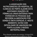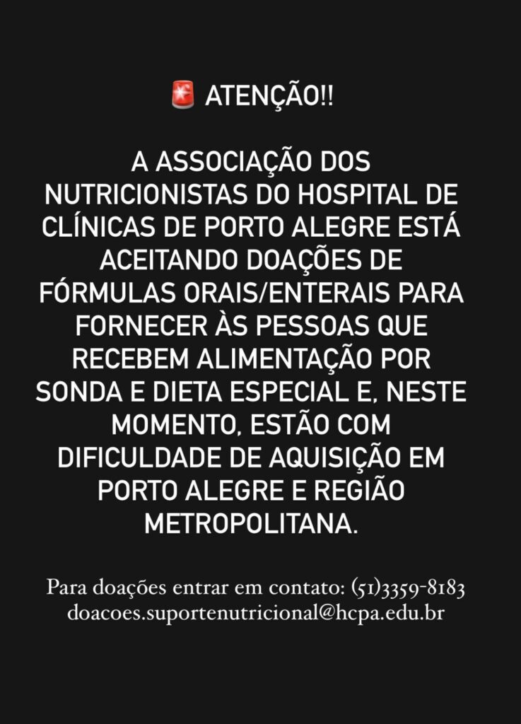 Diante da situação crítica em que se encontra o nosso Estado do RS, viemos utilizar esse espaço para divulgar a campanha que a Associação dos Nutricionistas do HCPA iniciou, pois muitos pacientes perderam tudo, inclusive seu estoque de fórmulas enterais.